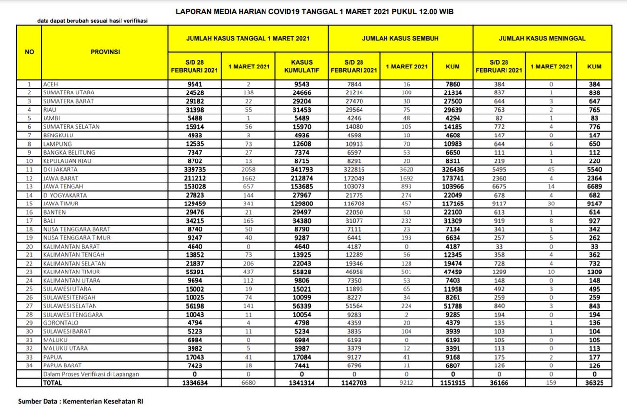 Berikut sebaran 6.680 kasus baru Corona di Indonesia, Senin (1/3/2021):
