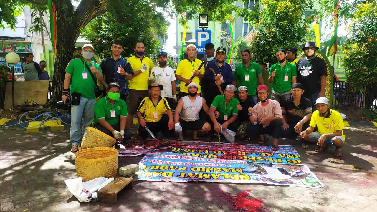 PEKANBARU – Kendati perekonomian masyarakat babak belur dihajar pandemi corona, Masjid Al-Jihad Jalan Melur Kelurahan Kedungsari, Kecamatan Sukajadi, Kota Pekanbaru, melakukan pemotongan 14 ekor sapi dan 3 ekor kambing kurban, Sabtu (1/8/2020) pagi.