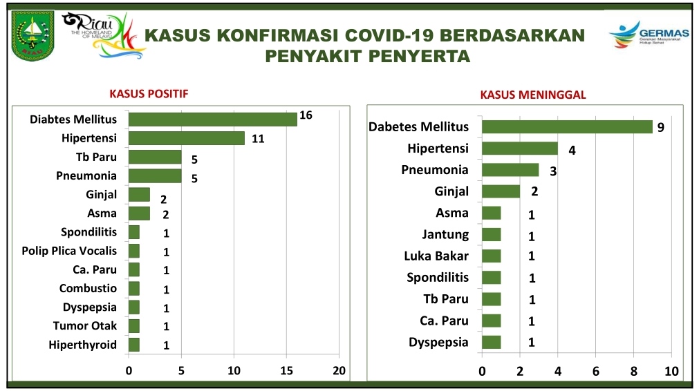 Perinciannya, pasien postif Covid-19 penyakit penyerta diabetes melitus 9 orang, hipertensi 4, pneumonia 3, ginjal 2, asma 1, jantung 1, luka bakar 1, spondilitis 1, TB paru 1, Ca. paru, 1, dyspepsia 1. (zon/riausatu.com)