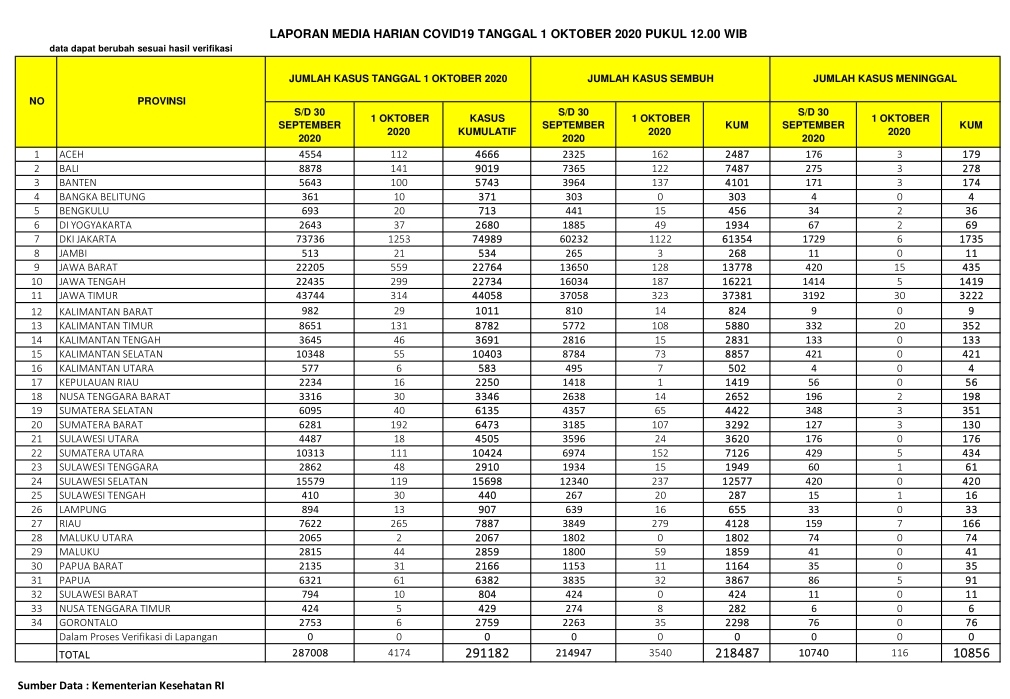 PEKANBARU – Kasus positif virus Corona (Covid-19) di Indonesia hari ini, Kamis (1/10/2020), bertambah 4.174 orang. Dengan penambahan tersebut, total kasus positif virus Corona di Indonesia hari ini menjadi 291.182 orang.