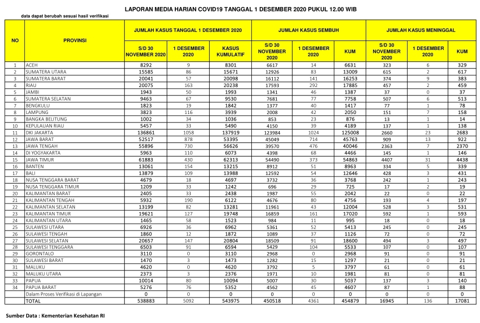 PEKANBARU – Kasus positif virus Corona (Covid-19) di  Indonesia, Selasa (1/12/2020), bertambah 5.092  orang. Dengan penambahan tersebut, total kasus positif virus Corona di Indonesia menjadi 543.975 orang.