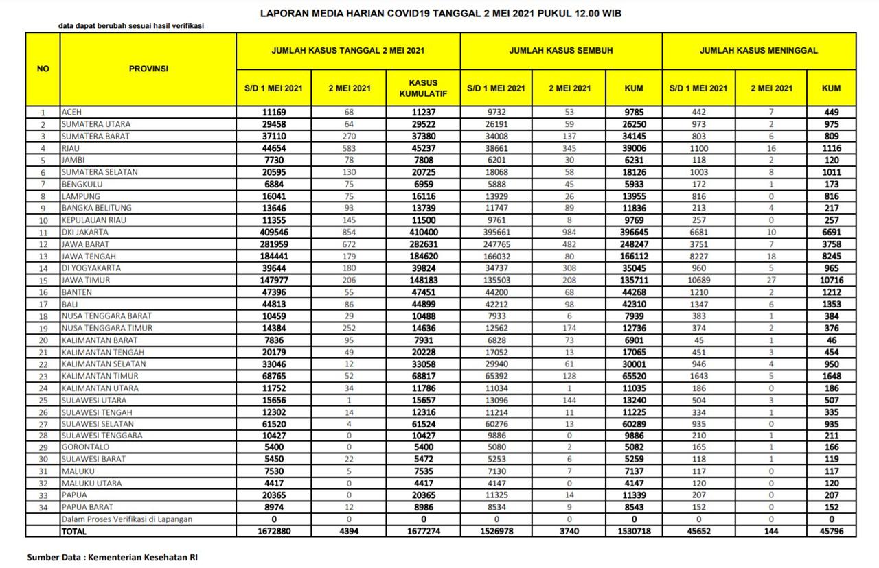 Berikut sebaran 4.394 kasus baru Corona di Indonesia, Ahad (2/5/2021):
