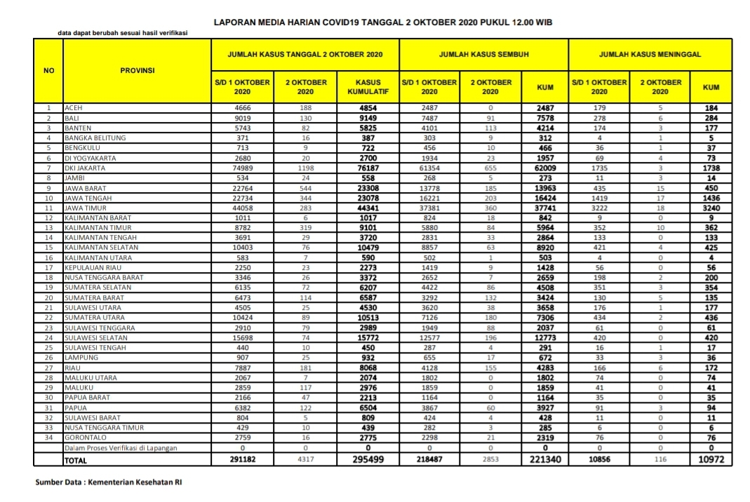 PEKANBARU – Kasus positif virus Corona (Covid-19) di Indonesia hari ini, Jumat (2/10/2020), bertambah 4.317 orang. Dengan penambahan tersebut, total kasus positif virus Corona di Indonesia hari ini menjadi 295.499 orang.