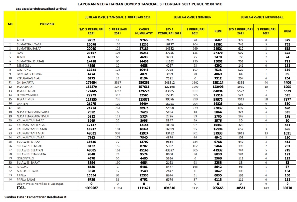 Berikut sebaran 11.984 kasus baru Corona di Indonesia, Rabu (3/2/2021):