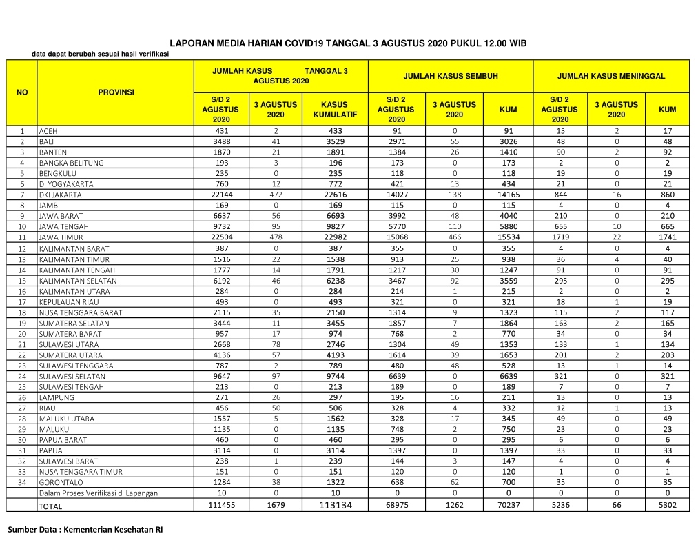 PEKANBARU – Jumlah kasus konfirmasi positif virus Corona Covid-19 di Indonesia hari ini, Senin (3/8/2020), bertambah 1.679 orang, menjadi total 113.134 kasus.