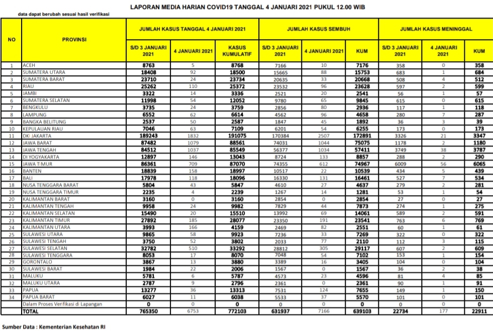 Berikut Sebaran 6.753 Kasus Baru Corona RI 4 Januari: Riau Tambah 110, 96 Sembuh