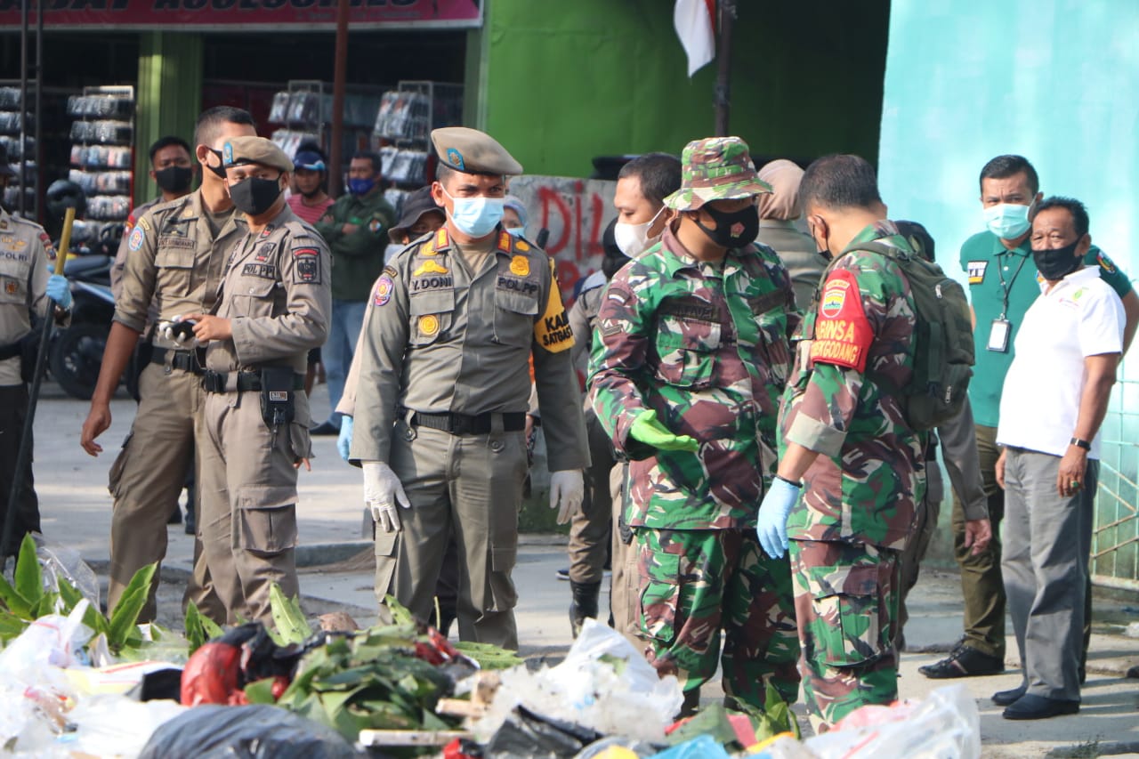 Petugas gabungan terdiri dari Satpol PP Kota Pekanbaru, Dinas Lingkungan Hidup dan Kebersihan (DLHK) Kota Pekanbaru, Polri dan TNI gotong royong bersama bersihkan tumpukan sampah  di persimpangan Jalan Teratai – Jalan Cempaka, Kamis (4/2/2021), sekitar pukul 7.30 WIB.