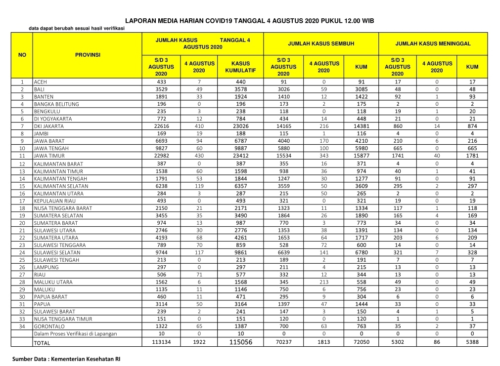 Dari data Kementerian Kesehatan RI, per hari ini, Selasa (4/8/2020),