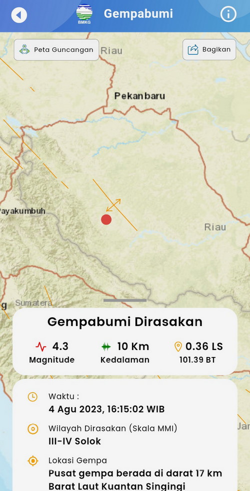 PEKANBARU – Kabupaten Kuantan Singingi, Provinsi Riau, diguncang gempa tektonik berkekuatan Magnitudo M4,3 yang terjadi pada Jum’at (4/8/2023) pukul 16.15 WIB.