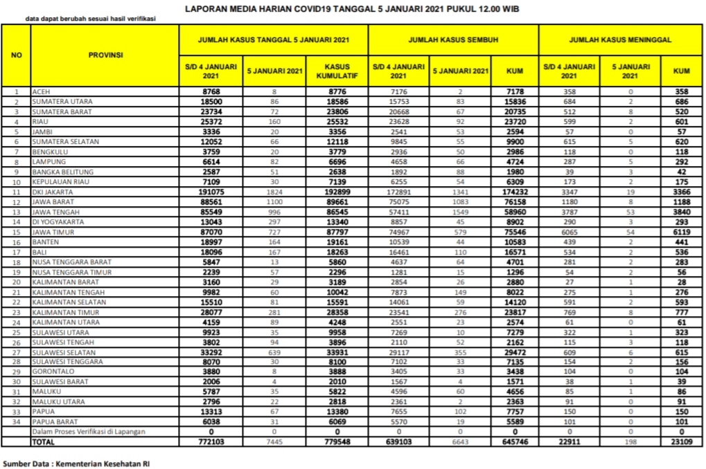 Berikut sebaran 7.445 kasus baru Corona di Indonesia, Selasa (5/1/2021):