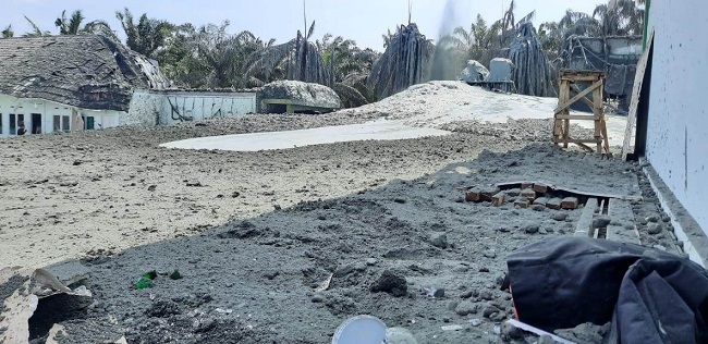 Debu berwarna abu-abu mirip abu vulkanik menutupi sebagian atap bangunan yang nampak sudah roboh akibat tertimpa batu. Sebagian bangunan yang masih utuh tertutupi debu. Di dalam gedung juga bertaburan batu-batu warna abu-abu yang berasal dari debu itu.
