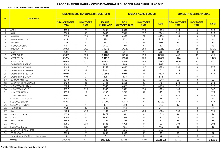 PEKANBARU – Kasus positif virus Corona (Covid-19) di Indonesia hari ini, Senin (5/10/2020), bertambah 3.622 orang. Dengan penambahan tersebut, total kasus positif virus Corona di Indonesia hari ini menjadi 307.120 orang.