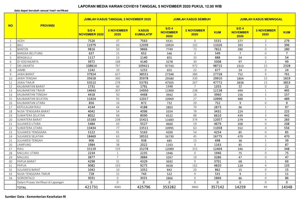 Berikut sebaran 4.065 kasus baru Corona di Indonesia, Kamis (5/11/2020):