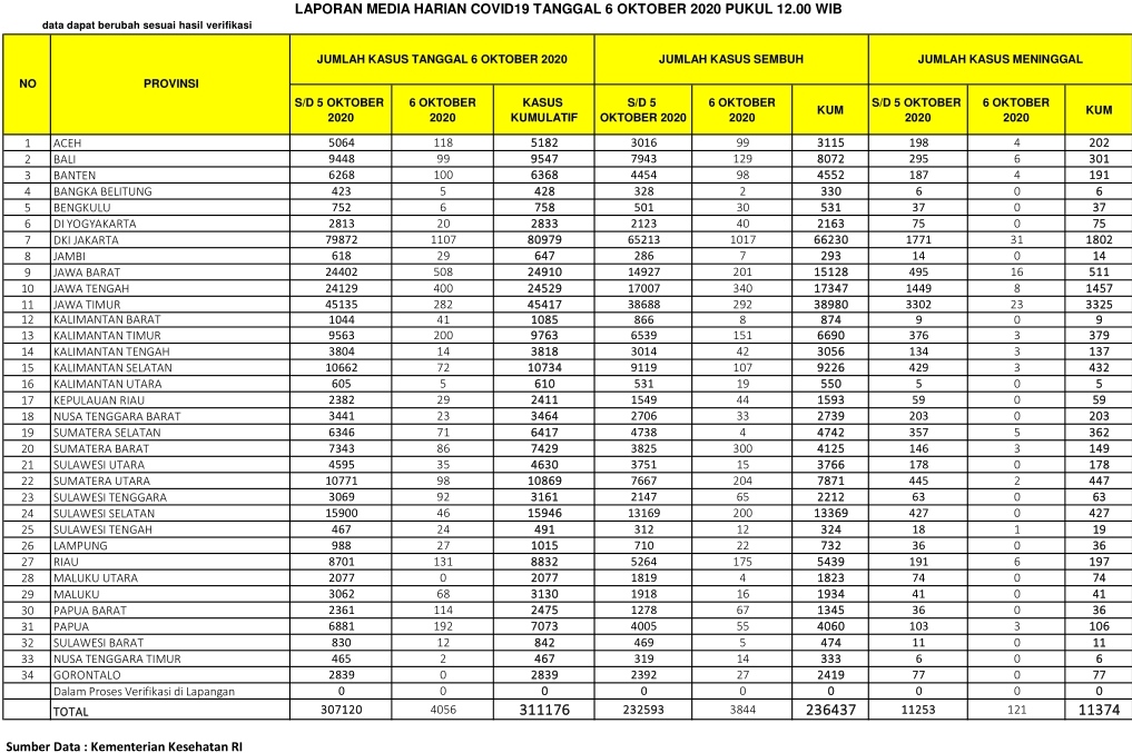 PEKANBARU – Kasus positif virus Corona (Covid-19) di Indonesia hari ini, Selasa (6/10/2020), bertambah 4.056 orang. Dengan penambahan tersebut, total kasus positif virus Corona di Indonesia hari ini menjadi 311.176 orang.