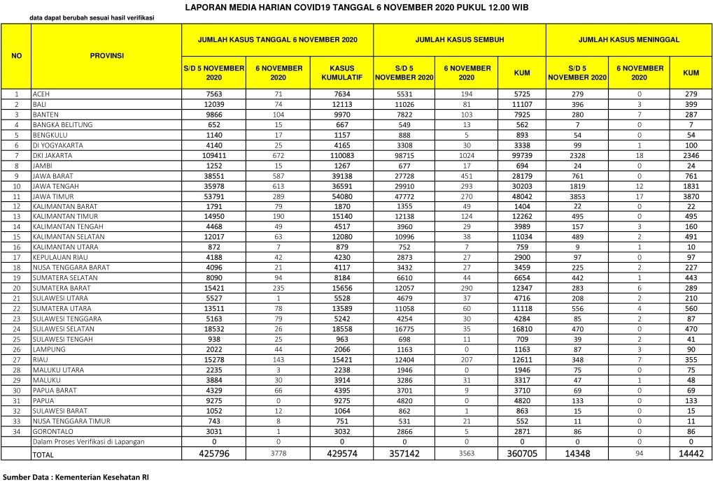 PEKANBARU – Kasus positif virus Corona (Covid-19) di Indonesia hari ini, Jumat (6/11/2020), bertambah 3.778 orang. Dengan penambahan tersebut, total kasus positif virus Corona di Indonesia menjadi 429.574 orang.