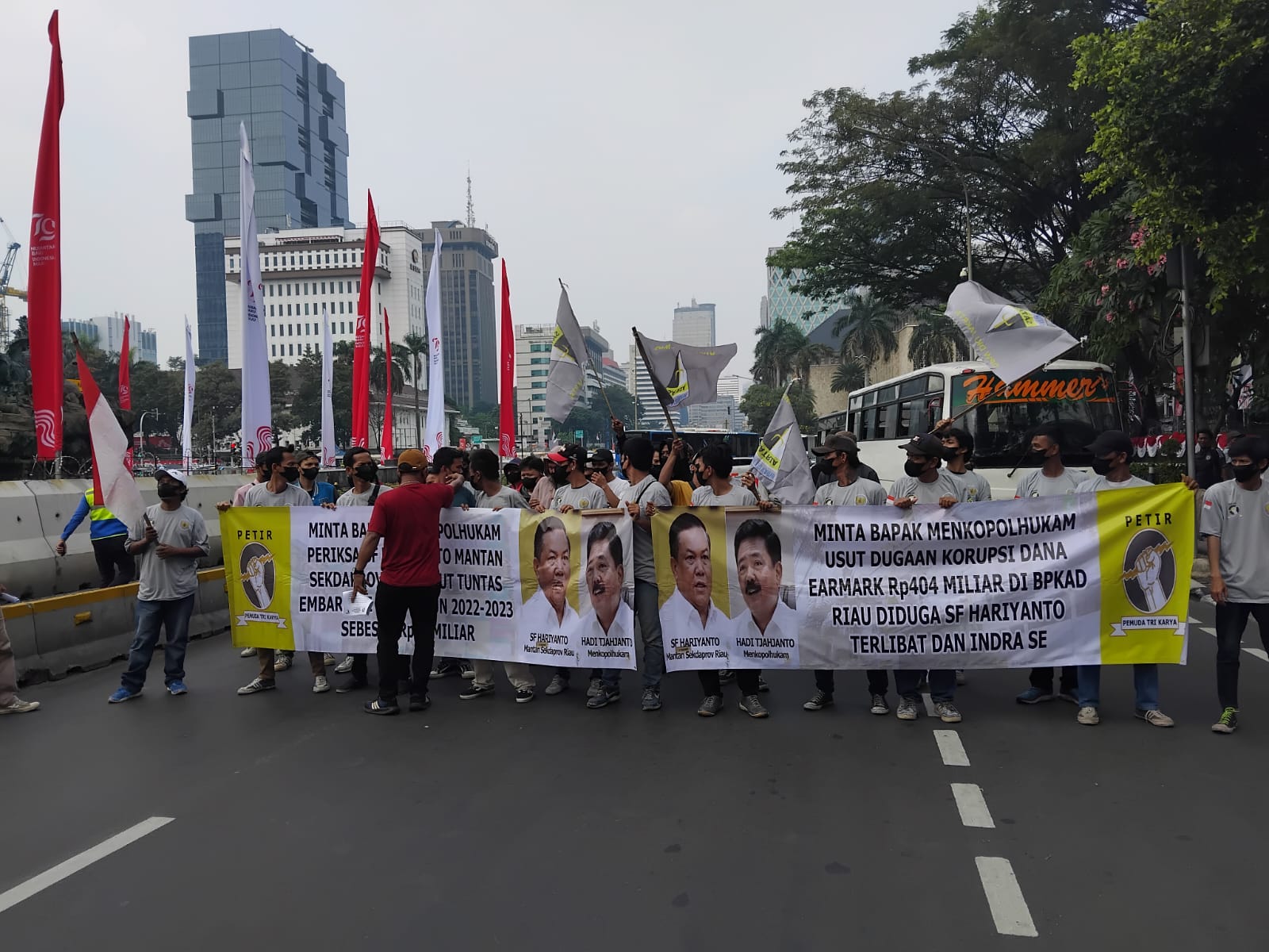 Dalam aksi yang dipimpin oleh DPW PETIR DKI Jakarta, menyinggung keterlibatan SF Haryanto selaku Sekretaris Daerah Provinsi Riau tahun 2021, 2022, dan 2023 atas dugaan korupsi Embarkasi Haji dan dugaan korupsi Dana Earmark.