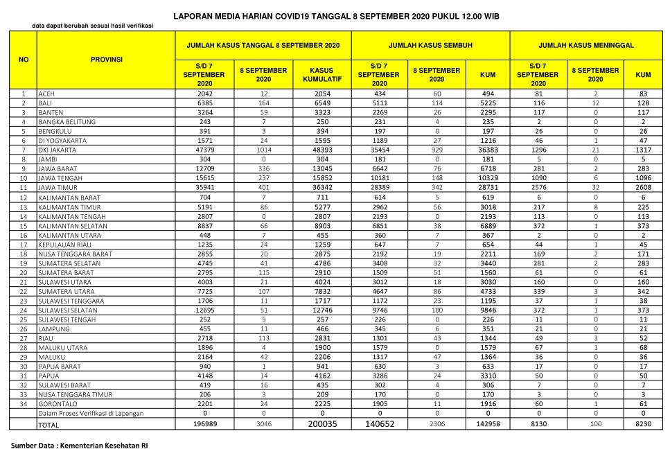 PEKANBARU – Kasus positif virus Corona (Covid-19) di Indonesia hari ini, Selasa (8/9/2020), bertambah 3.046 orang. Dengan penambahan tersebut, total kasus positif virus Corona di Indonesia hari ini menjadi 200.035 orang.