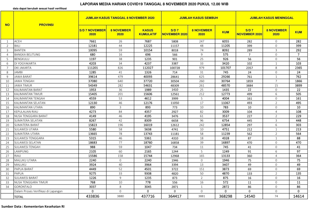 PEKANBARU – Kasus positif virus Corona (Covid-19) di Indonesia hari ini, Ahad (8/11/2020), bertambah 3.880 orang. Dengan penambahan tersebut, total kasus positif virus Corona di Indonesia menjadi 437.716 orang.
