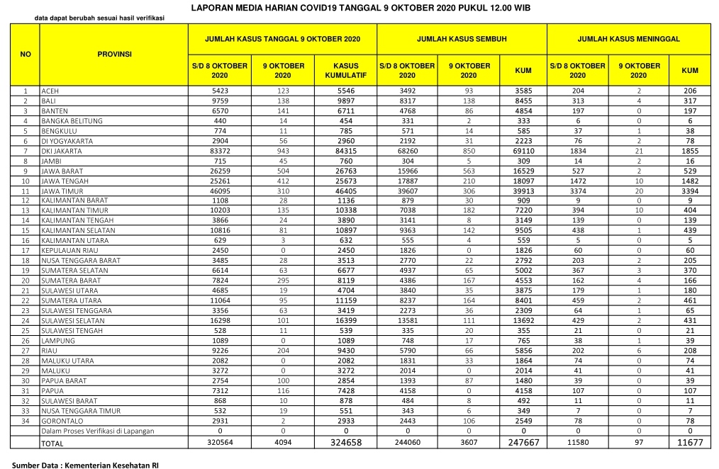 PEKANBARU – Kasus positif virus Corona (Covid-19) di Republik Indonesia (RI) hari ini, Jumat (9/10/2020), bertambah 4.094 orang. Dengan penambahan tersebut, total kasus positif virus Corona di Indonesia hari ini menjadi 324.658 orang.