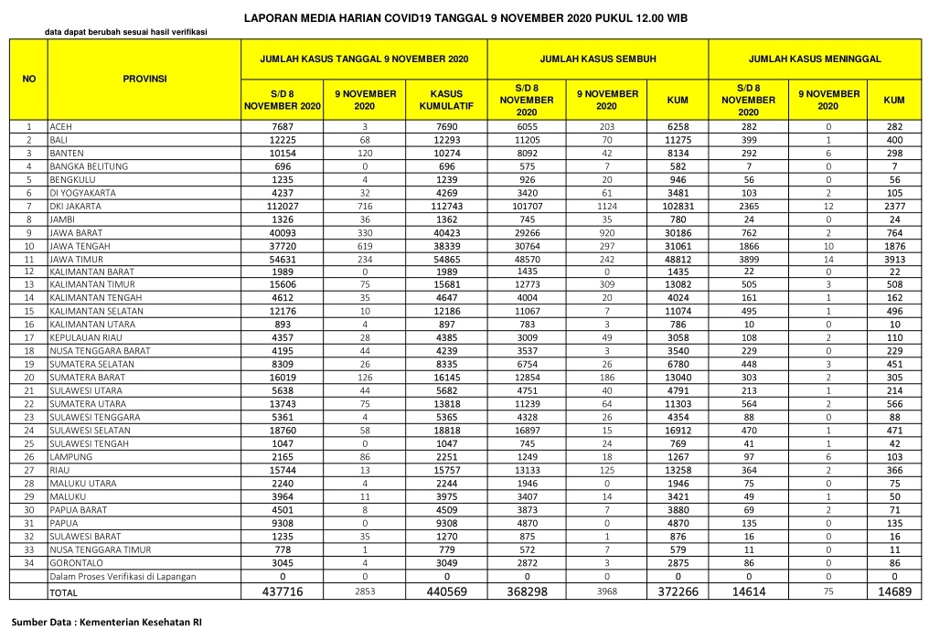 PEKANBARU – Kasus positif virus Corona (Covid-19) di Indonesia hari ini, Senin  (9/11/2020), bertambah 2.853 orang. Dengan penambahan tersebut, total kasus positif virus Corona di Indonesia menjadi 440.569 orang.