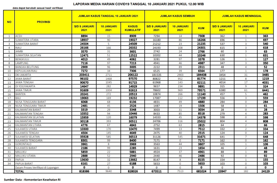 PEKANBARU – Kasus positif virus Corona (Covid-19) di Republik Indonesia (RI), Ahad   (10/1/2021), bertambah 9.640 orang. Dengan penambahan tersebut, total kasus positif virus Corona di Indonesia menjadi 828.026 kasus.