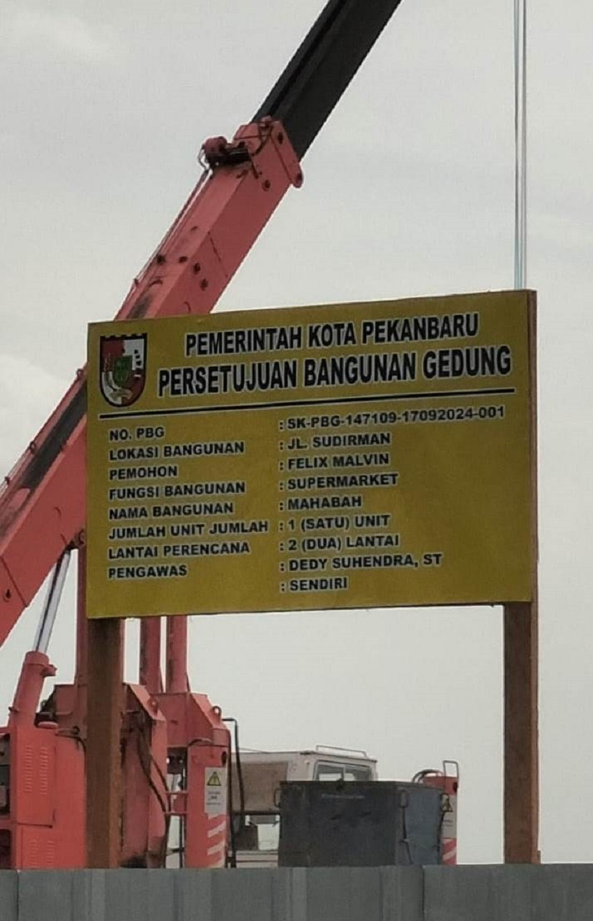 Papan nama Persetujuan Bangunan Gedung (PBG) yang dituding Komisi IV DPRD Pekanbaru nomornya bodong alias ilegal. (f: istimewa)