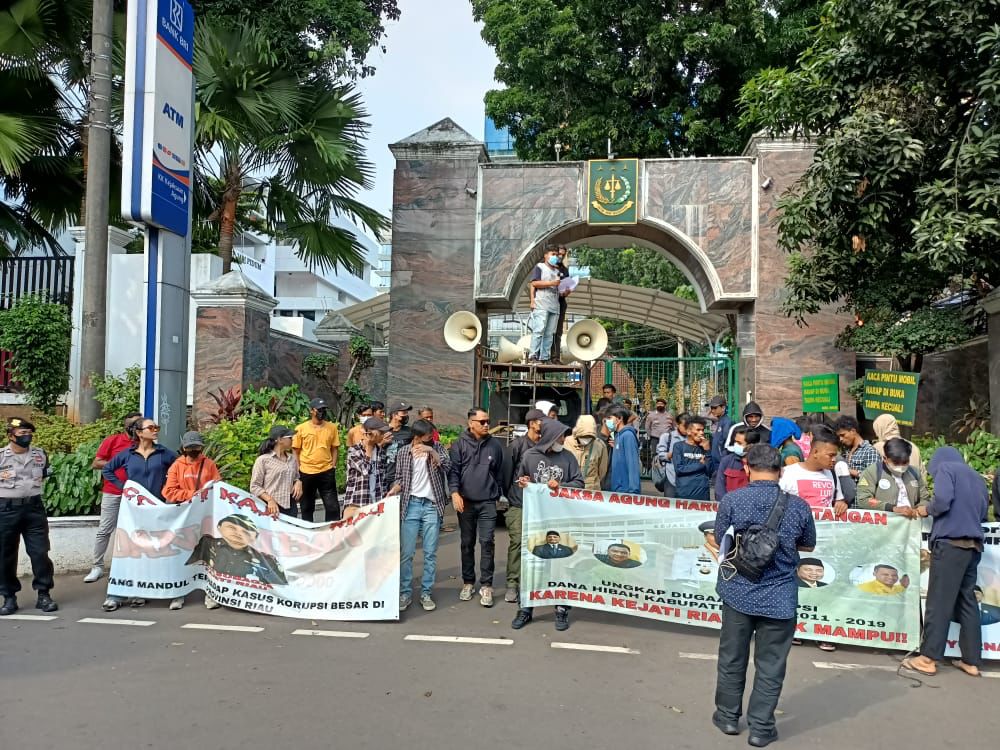 Sambil berorasi, mereka membentangkan sejumlah spanduk meminta Kejagung turun tangan mengungkap dugaan korupsi dana hibah Pemerintah Kabupaten Siak periode 2011 hingga 2015.