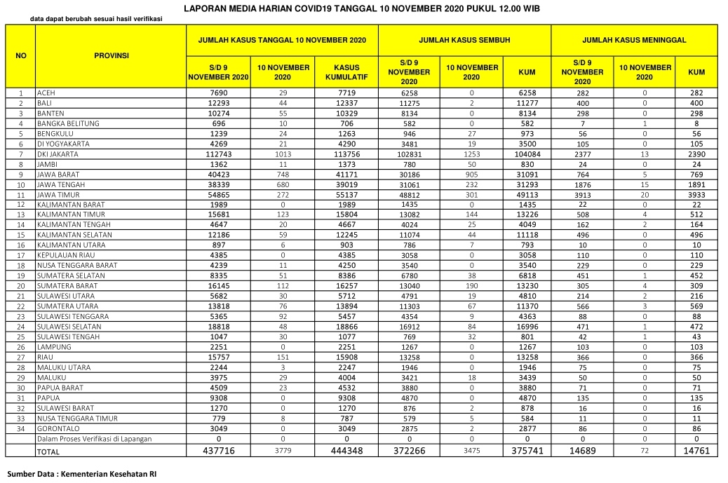 PEKANBARU – Kasus positif virus Corona (Covid-19) di Indonesia hari ini, Selasa (10/11/2020), bertambah 3.779 orang. Dengan penambahan tersebut, total kasus positif virus Corona di Indonesia menjadi 444.348 orang.