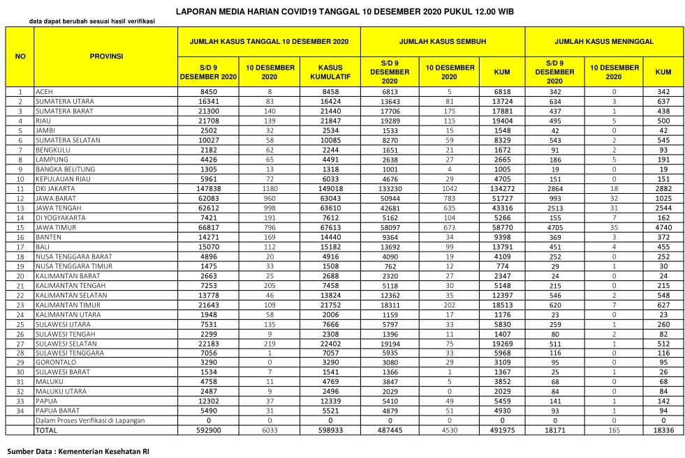 Berikut sebaran 6.033 kasus baru Corona di Indonesia, Kamis (10/12/2020):