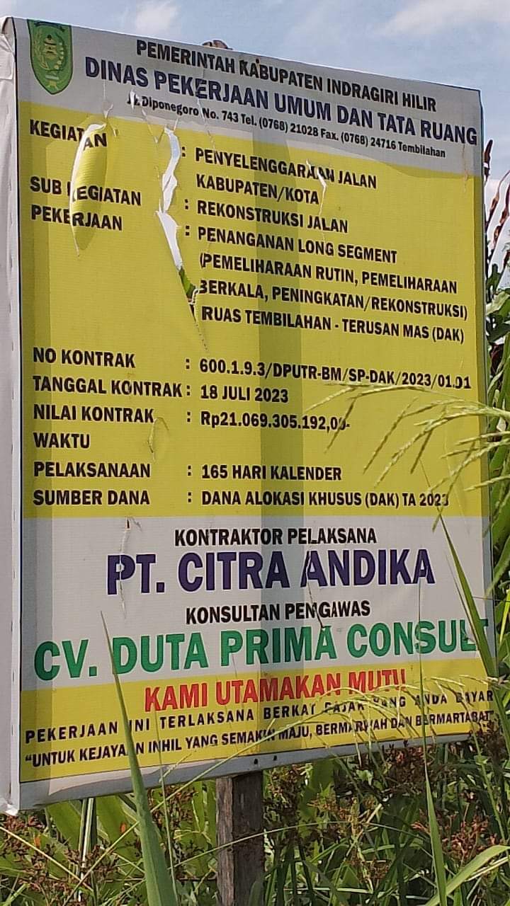 TEMBILAHAN – Proyek Rekonstruksi Jalan Penanganan Long Segment (Pemeliharaan Rutin, Pemeliharaan Berkala, Peningkatan/Rekonstruksi) Ruas Tembilahan–Terusan Mas (DAK) senilai Rp21 miliar lebih, terancam putus kontrak.