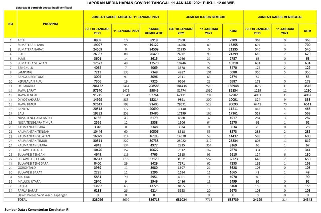 PEKANBARU – Kasus positif virus Corona (Covid-19) di Republik Indonesia (RI), Senin (11/1/2021), bertambah 8.692 orang. Dengan penambahan tersebut, total kasus positif virus Corona di Indonesia menjadi 836.718 kasus.