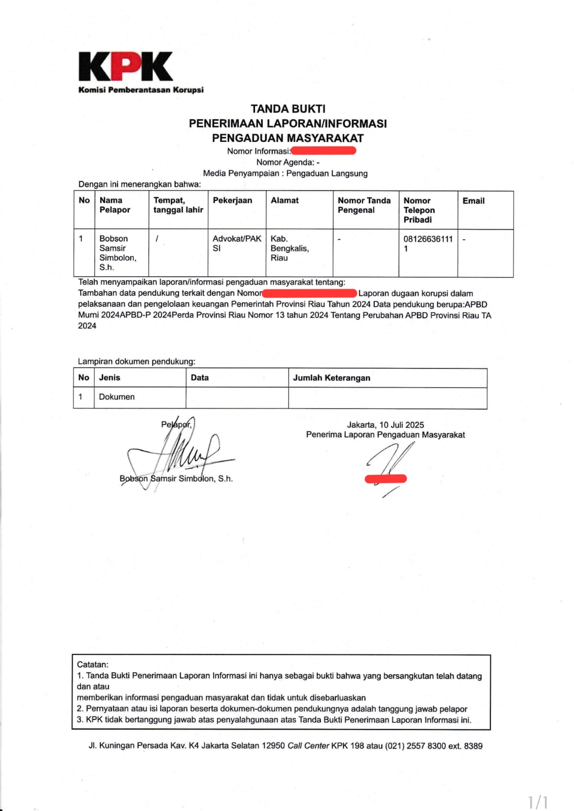 Bobson ke KPK, Serahkan Uraian Fakta dan Dokumen Dugaan Tipikor Pengelolaan Keuangan Pemprov Riau 2024