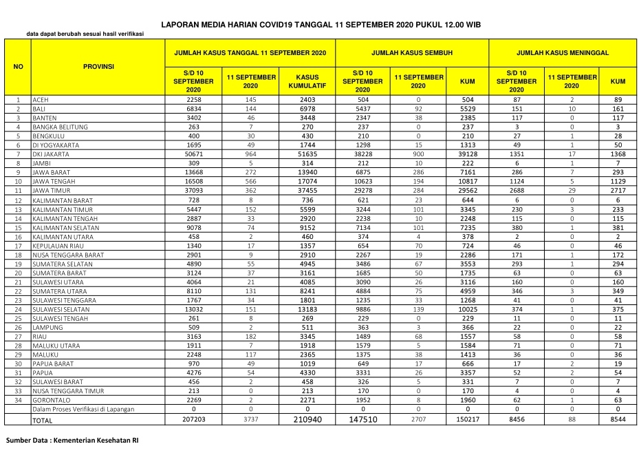 PEKANBARU – Kasus positif virus Corona (Covid-19) di Indonesia hari ini, Jumat (11/9/2020), bertambah 3.737 orang. Dengan penambahan tersebut, total kasus positif virus Corona di Indonesia hari ini menjadi 210.940 orang.