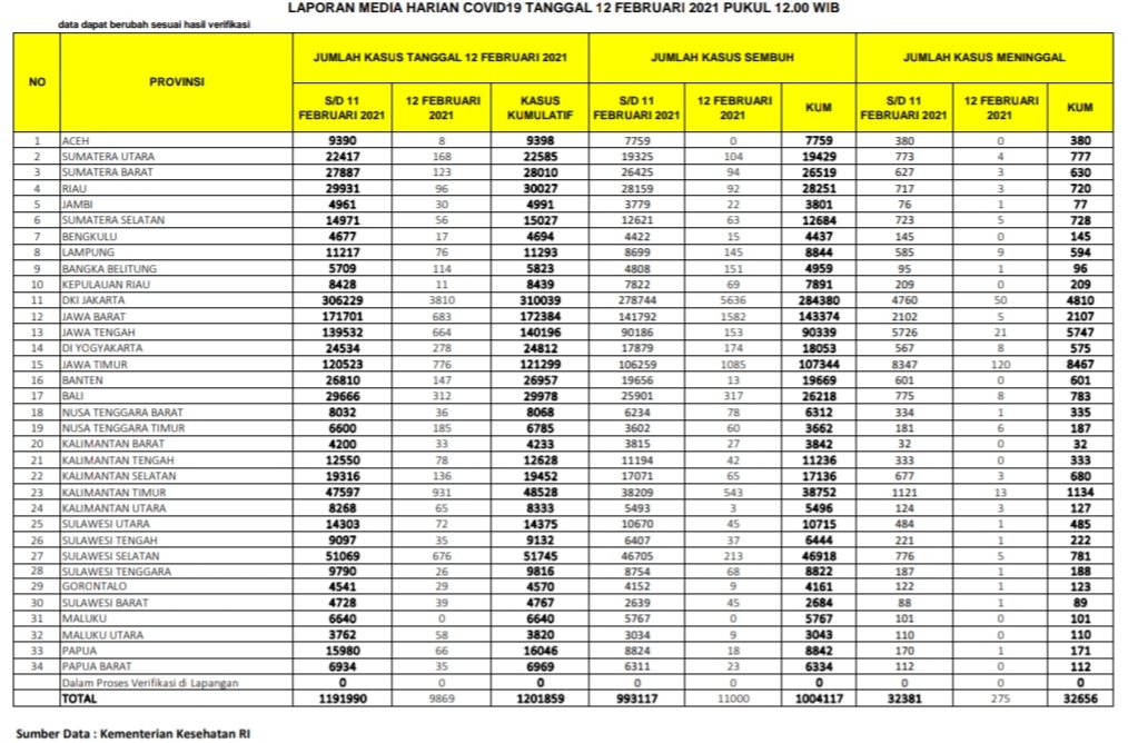 Berikut sebaran 9.869 kasus baru Corona di Indonesia, Jumat (12/2/2021):