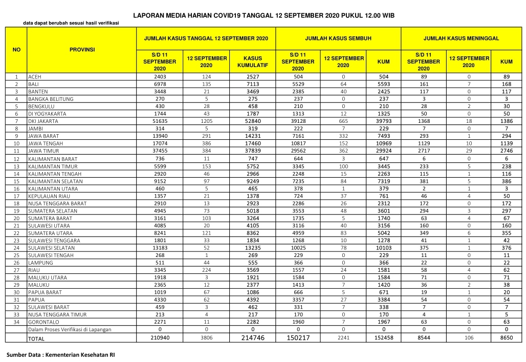 PEKANBARU – Kasus positif virus Corona (Covid-19) di Indonesia hari ini, Sabtu (12/9/2020), bertambah 3.806 orang. Dengan penambahan tersebut, total kasus positif virus Corona di Indonesia hari ini menjadi 214.746 orang.