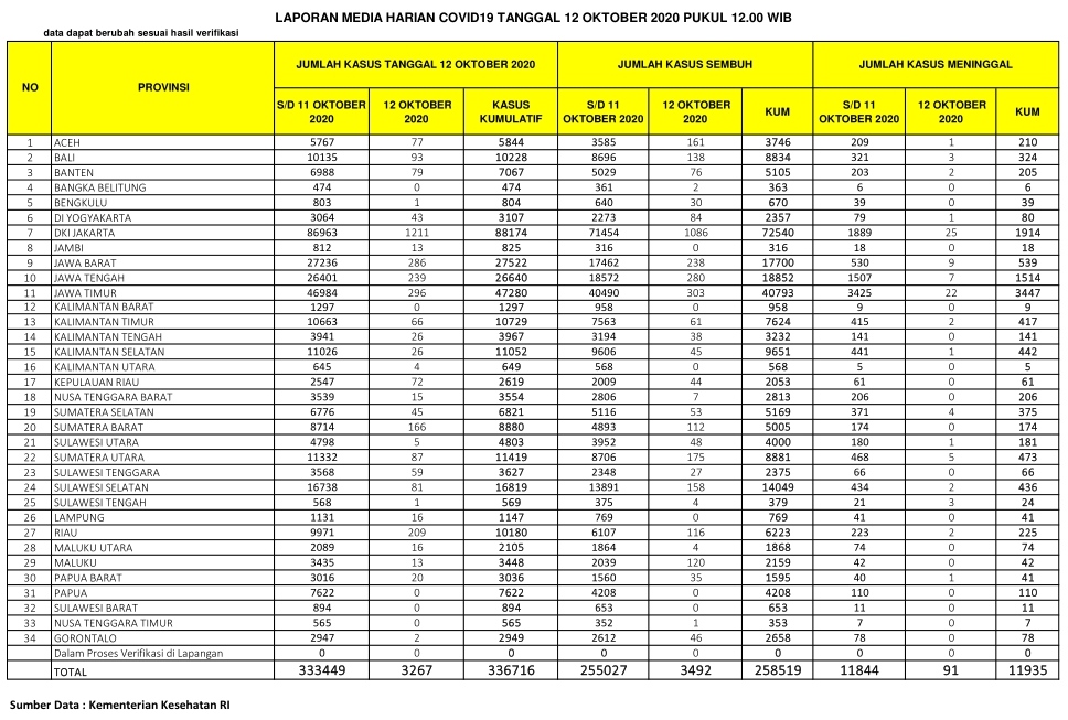 Berikut sebaran 3.267 kasus baru Corona di Indonesia, Senin (12/10/2020):