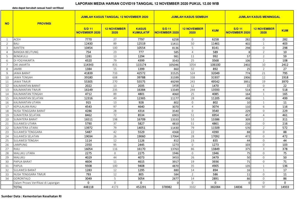 PEKANBARU – Kasus positif virus Corona (Covid-19) di Indonesia hari ini, Kamis (12/11/2020), bertambah 4.713 orang. Dengan penambahan tersebut, total kasus positif virus Corona di Indonesia menjadi 452.291 orang.