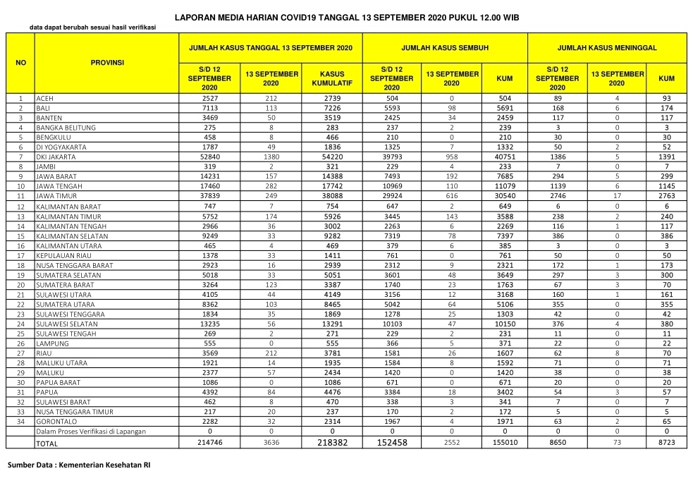 Berikut sebaran 3.636 kasus baru Corona di Indonesia, Ahad (13/9/2020):