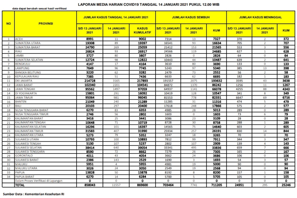 Berikut sebaran 11.557 kasus baru Corona di Indonesia, Kamis (14/1/2021):