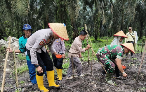 SIAKHULU-Guna mendukung program pemerintah ketahanan pangan, Kapolsek Siakhulu Kompol Fauzi melakukan penanaman jagung Pipil (Tumpang Sari) di lahan PT Agro Abdi l Desa Kepau Jaya, Kecamatan Siakhulu, Kabupaten Kampar, Jum’at (14/3/2025).