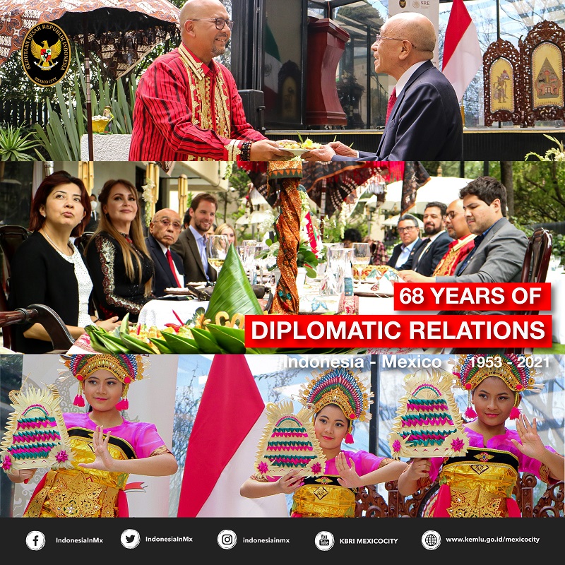 Mexico City, Meksiko – Indonesia dan Meksiko telah memiliki hubungan diplomatik yang telah terjalin sejak 6 April 1953. Merayakan 68 tahun hubungan diplomatik Indonesia – Meksiko, KBRI Mexico City selenggarakan resepsi terbatas yang dihadiri oleh tokoh-tokoh dari pemerintahan, kalangan pebisnis dan publik (09/04/2021).