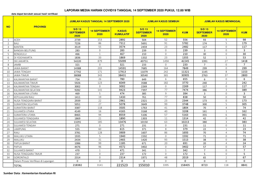 PEKANBARU – Kasus positif virus Corona (Covid-19) di Indonesia hari ini, Senin (14/9/2020), bertambah 3.141 orang. Dengan penambahan tersebut, total kasus positif virus Corona di Indonesia hari ini menjadi 221.523 orang.