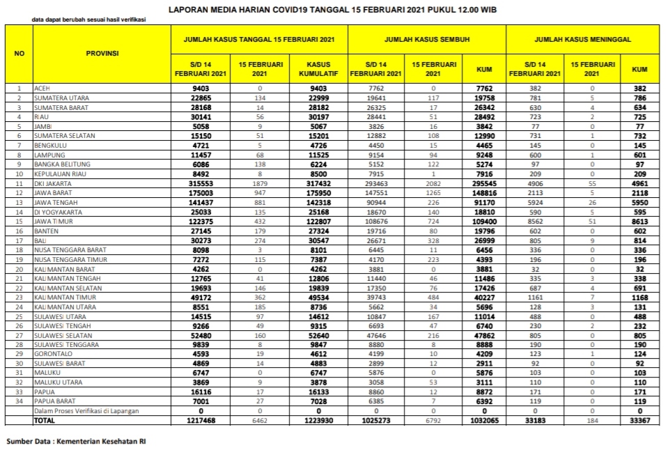 Berikut sebaran 6.462 kasus baru Corona di Indonesia, Senin (15/2/2021):