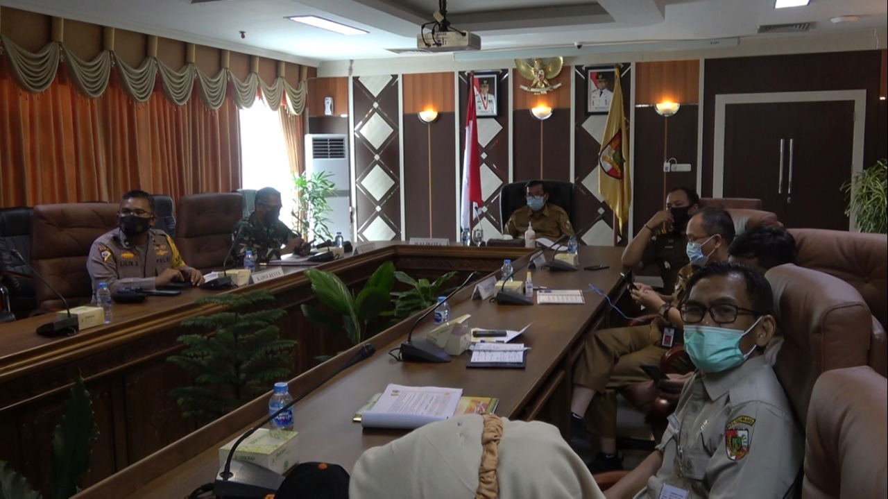 PEKANBARU – Walikota Pekanbaru Firdaus, mengikuti rapat koordinasi dan penetapan status “Siaga Darurat” penanggulangan bencana kebakaran hutan dan lahan (karhutla) di Provinsi Riau tahun 2021 secara virtual bersama Gubernur Riau, di lantai V Gedung Utama Komplek Perkantoran Tenayan Raya, Senin (15/2/2021).