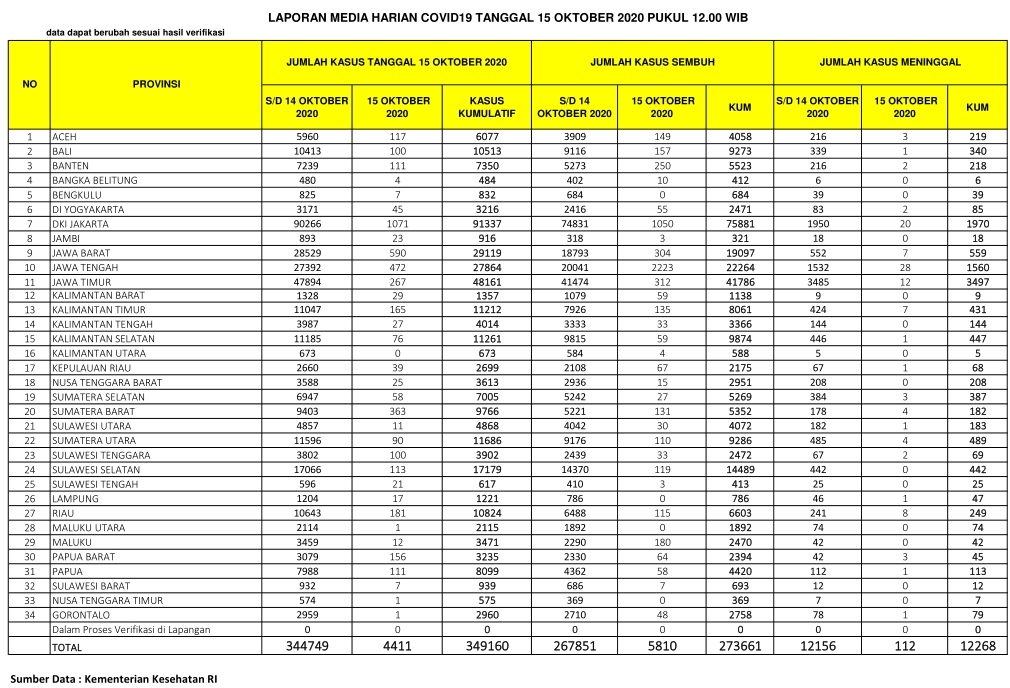 PEKANBARU – Kasus positif virus Corona (Covid-19) di Indonesia hari ini, Kamis  (15/10/2020), bertambah 4.411 orang. Dengan penambahan tersebut, total kasus positif virus Corona di Indonesia hari ini menjadi 349.160 orang.