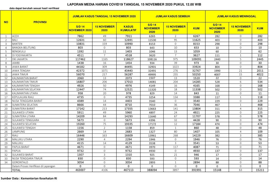 Berikut sebaran 4.106 kasus baru Corona di Indonesia, Ahad (15/11/2020):