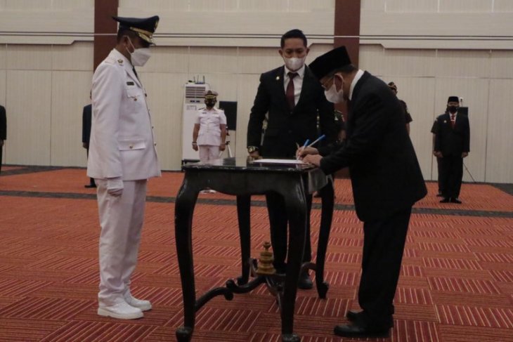 Saifuddin Djuba yang juga Kepala Biro Pengadaan Barang dan Jasa (BPBJ) Pemprov Malut Malut diambil sumpahnya menjadi Penjabat Bupati Halut pada Kamis (15/4) oleh Gubernur Malut Abdul Gani Kasuba.(*/cr9)