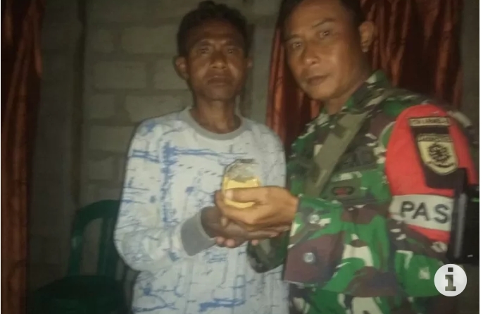 Kupang – Seorang warga Desa Saenan, Kabupaten Timor Tengah Utara, Nusa Tenggara Timur, Fobia (39) menyerahkan sebuah granat aktif berjenis manggis untuk diamankan Satuan Tugas Pengamanan Perbatasan (Satgas Pamtas) RI-Timor Leste.