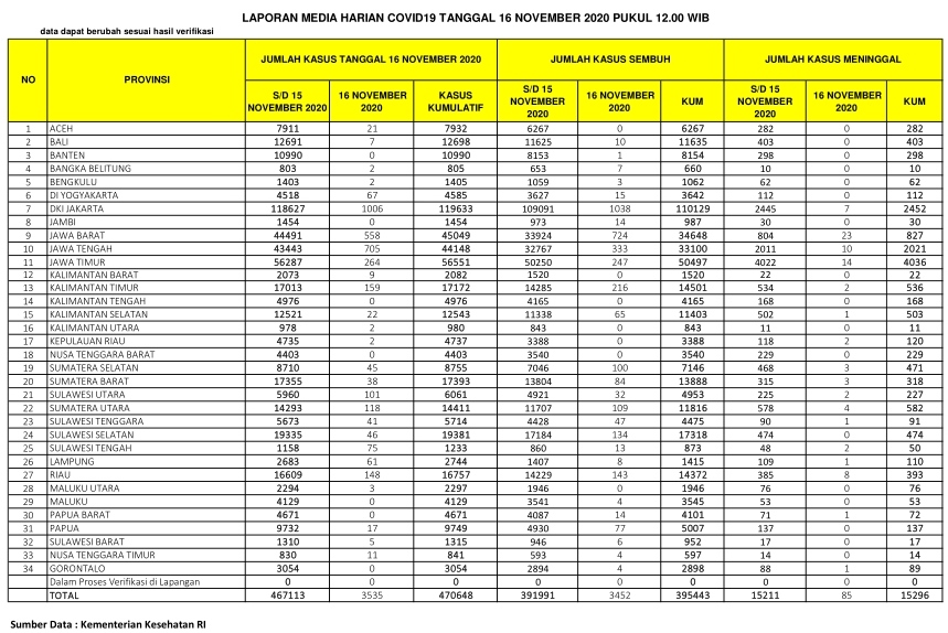 Berikut sebaran 3.535 kasus baru Corona di Indonesia, Senin (16/11/2020):