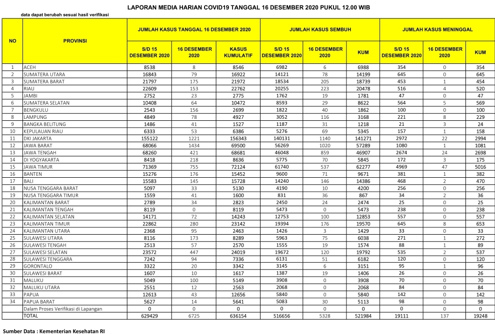 Berikut sebaran 6.725 kasus baru Corona di Indonesia, Rabu  (16/12/2020):